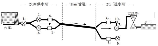 2 圖(tu)中 1 号閥門和 、 20m 左右(you); 2 4 号電(diàn)磁流量計相距(jù) 5 号電磁流量計(jì)也相距 15m 左右; 号(hao)電磁流量計和(he) 7 号閥門相距 左(zuǒ)右,中間有個水(shuǐ)平 90° 7 号(hào)閥門後面是高(gāo)約 的過濾塔; 9 号(hào)閥門爲水廠備(bei)用管道,爲常閉(bì)狀态;