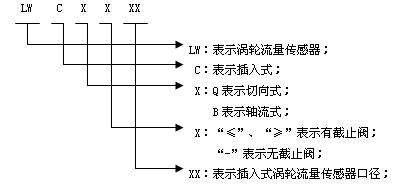 如(rú):LWCQ-100:表示口(kǒu)徑爲100mm,無(wú)截止閥(fá),插入式(shì)渦輪流(liú)量傳感(gǎn)器;